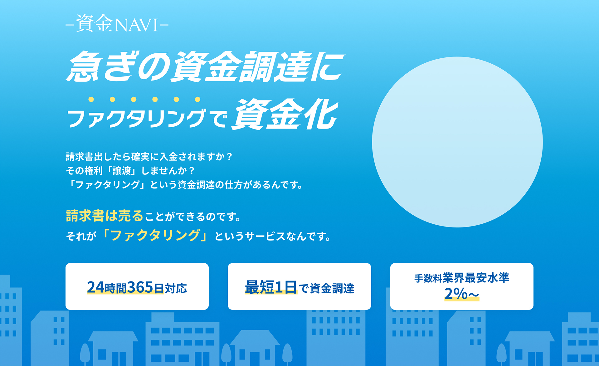 当社は企業向けのホームページ・ランディングページ等の制作を中心に行っている小さな会社です。企業からの入金は納品から約2か月後だったり、決算の都合で多少変化したりと、キャッシュフローが上手く回らない状況が続いていました。この度、企業からの入金が遅れた事に伴い、スタッフの給与が遅れてしまう可能性が出てきてしまったため、慌てて資金繰りを行う事となり、ハイスピードで有名な「資金ナビ」さんに相談してみる事に。夜だったにも関わらずすぐに対応して下さり、ファクタリング内容・見積り等をすぐに提示してもらえました。手数料も手ごろで即決でOKした所、急いでいる弊社を気遣ってか、即入金して頂き、無事危機を脱出する事ができました。また、ピンチが訪れた際は真っ先にご相談したいと思います。
